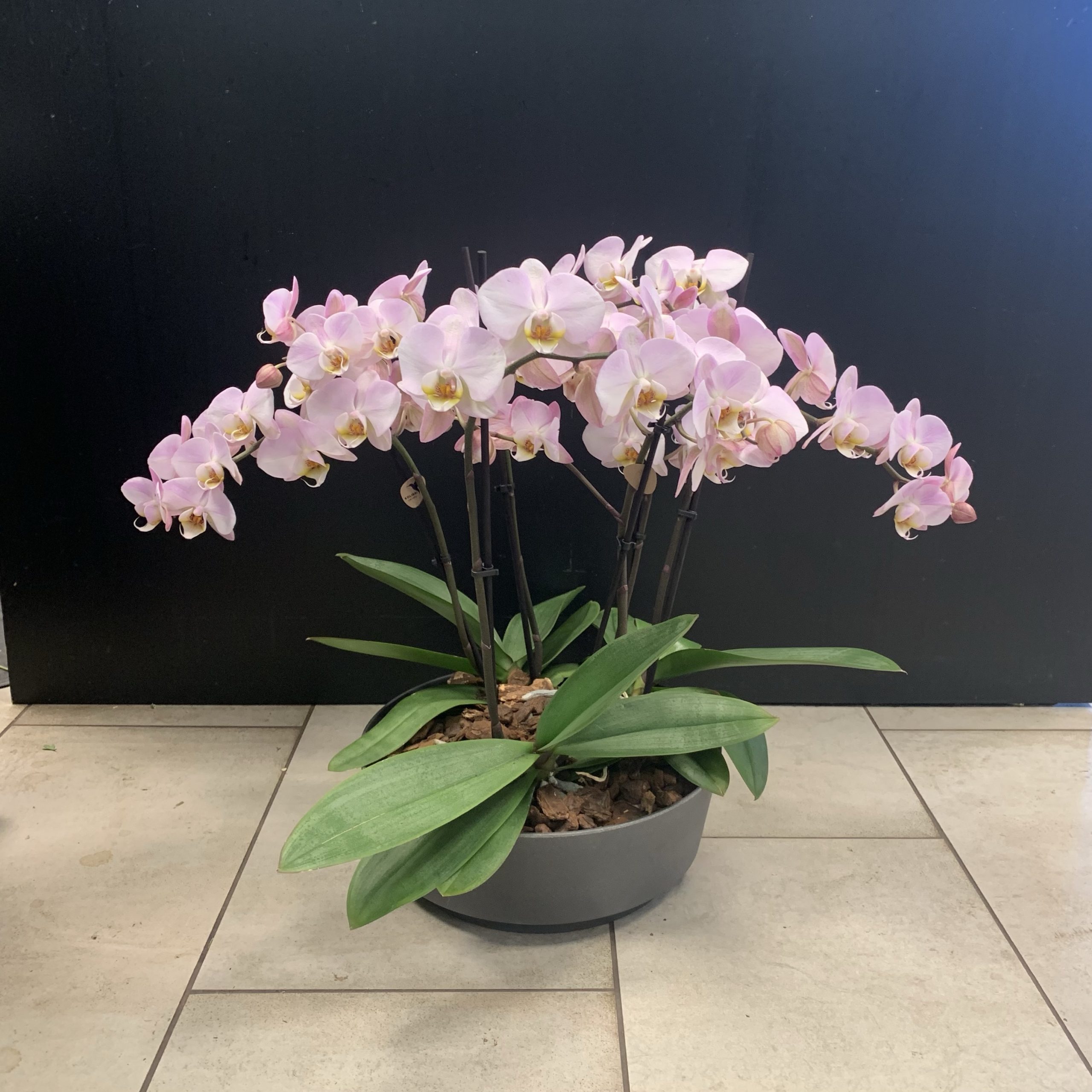 Lyxig plantering med rosa orkidéer.