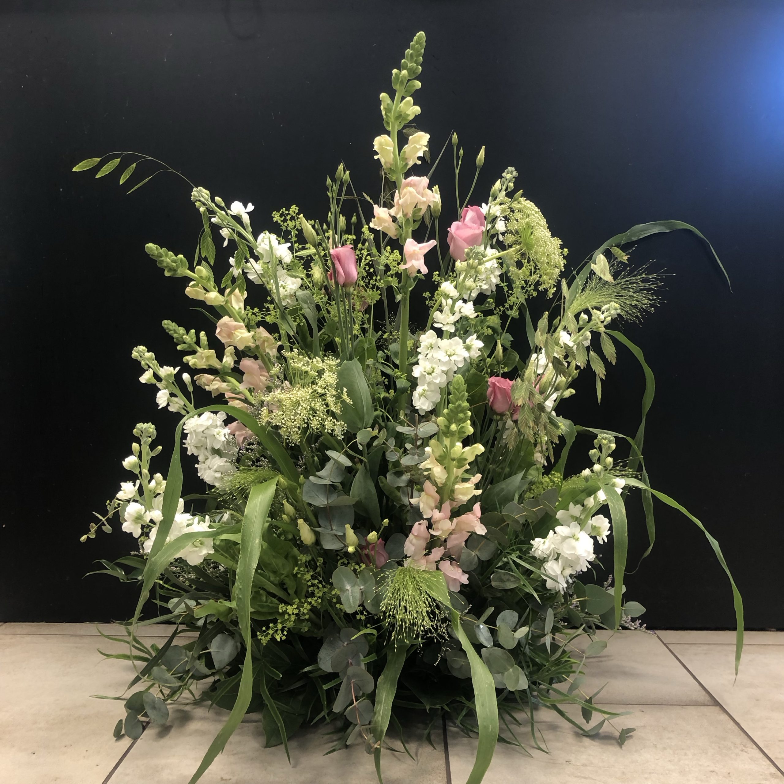 Trädgårdsinspirerad sorgdekoration i ljusa toner.