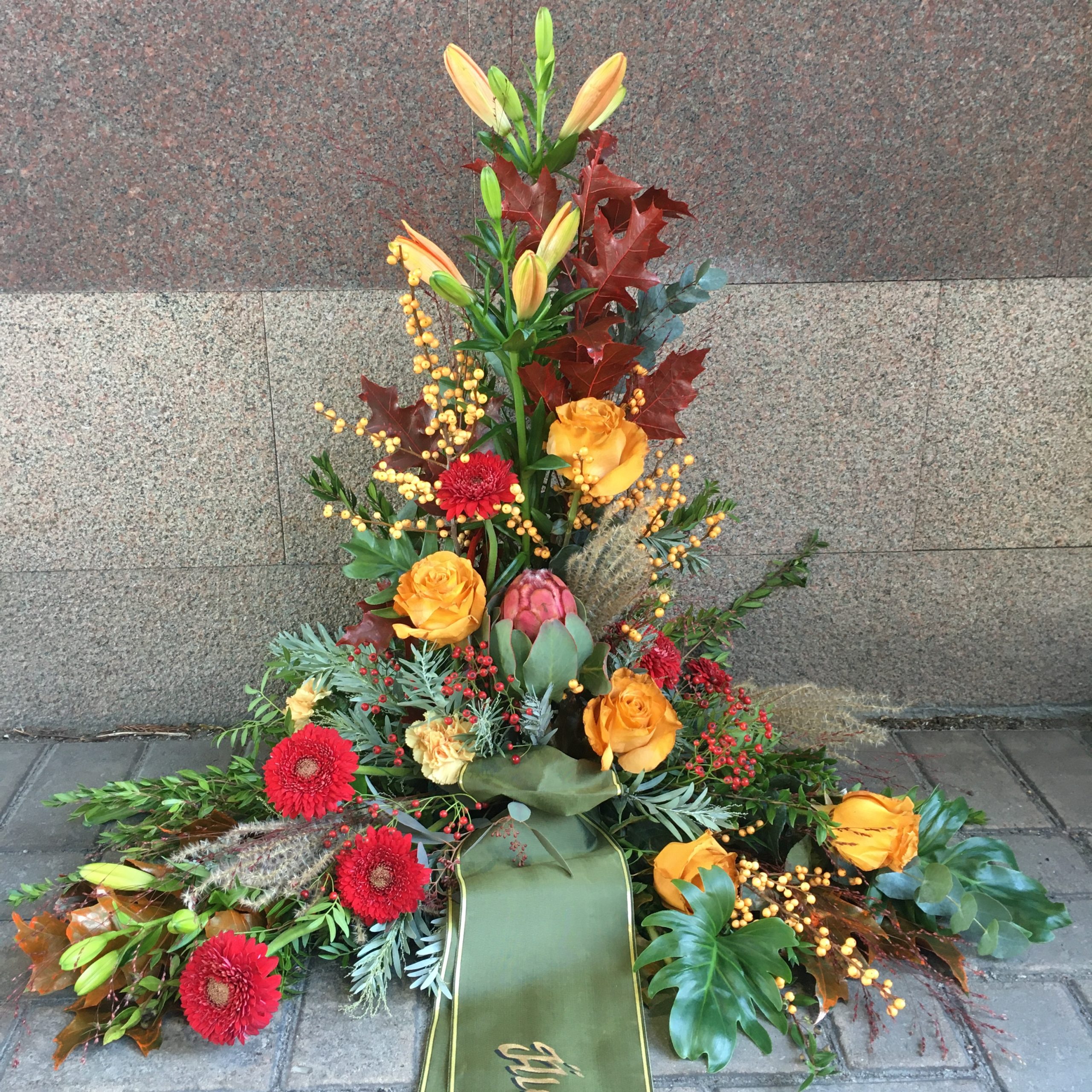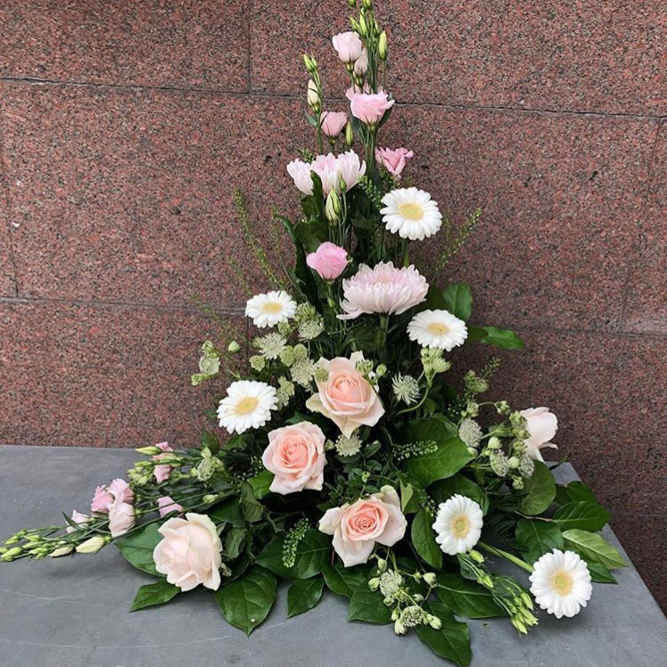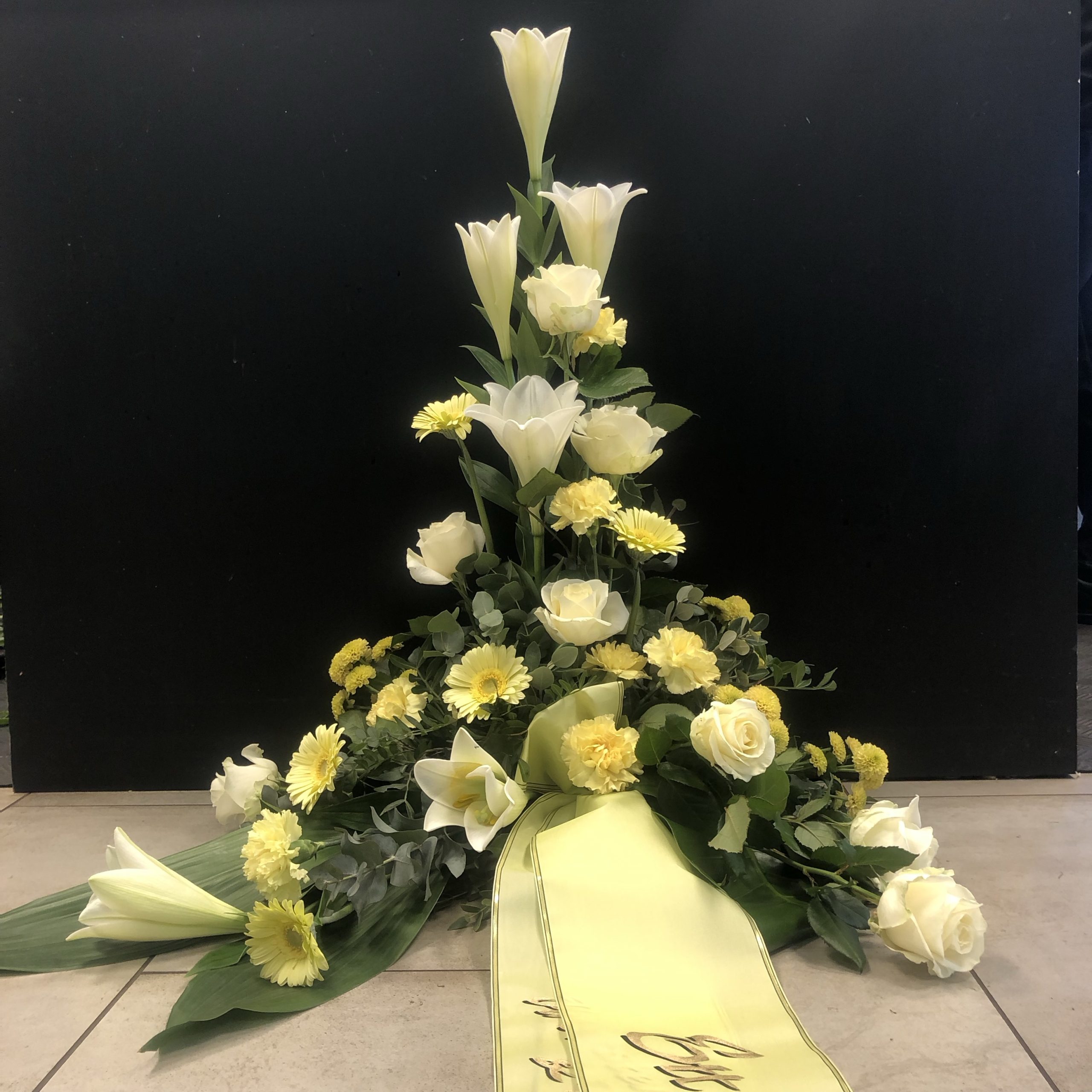Stående sorgdekoration med säsongens blommor som finns i tre olika färgkombinationer. Tänk på att liljor kan dofta starkt.